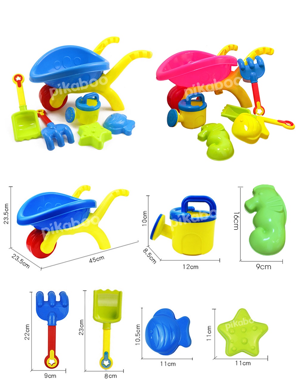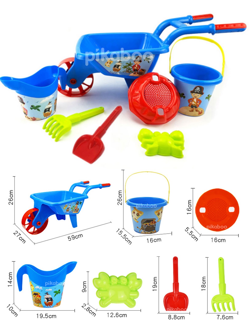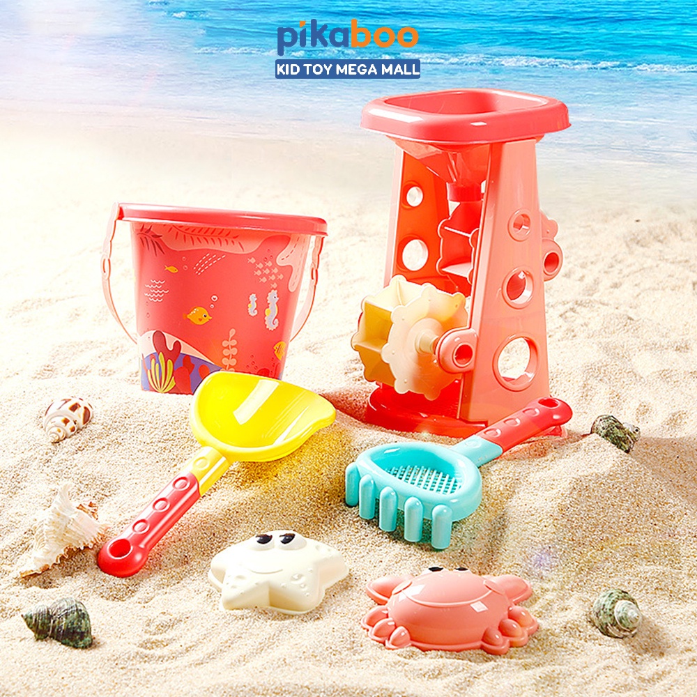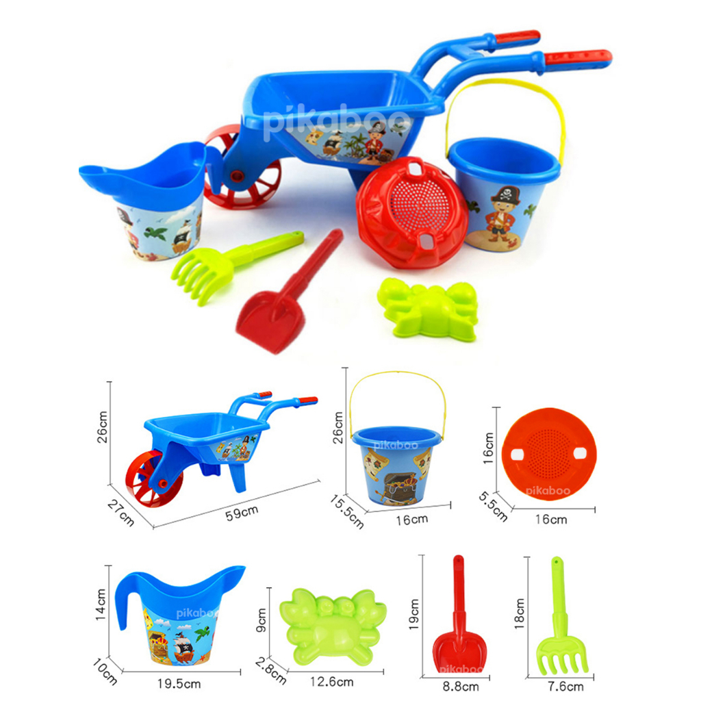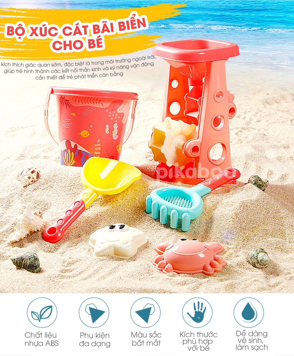 Bộ đồ chơi đi biển guồng cát, xe chở cát, xe đổ cát được làm bằng chất liệu nhựa cao cấp an toàn, đa màu tươi sắc rất xịn, cầm và chơi đều chắc nịch. Bộ đồ chơi gồm 6-7 món tuỳ từng bộ: xe chở cát, xe đổ cát, guồng cát, xẻng xúc cát, cào cát, ô doa nước, khuôn tạo hình sao biển, ốc biển/cua/cá/cá ngựa. Phù hợp cho bé từ 3 tuổi trở lên thoải mái vui chơi, đặc biệt là vào những ngày hè.