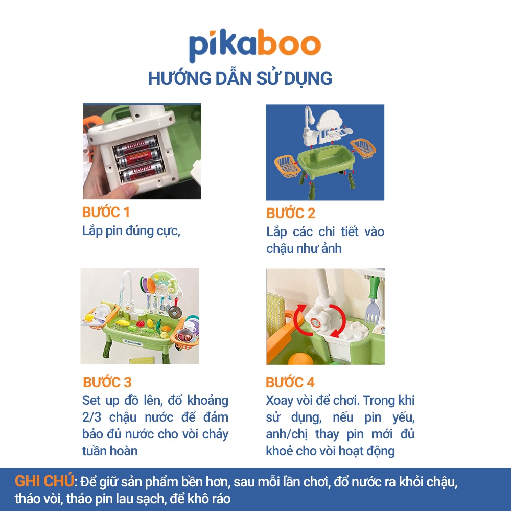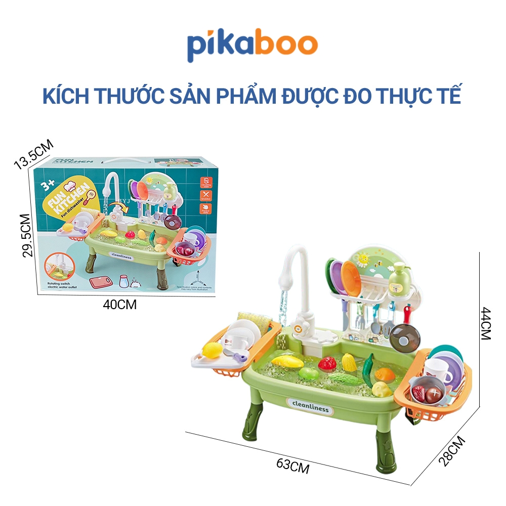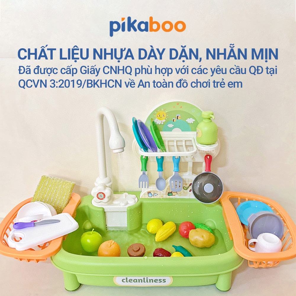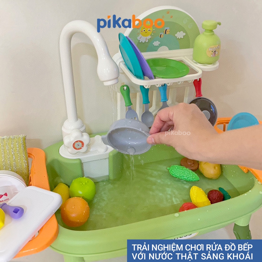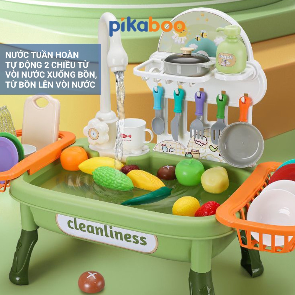 Bộ đồ chơi chậu rửa nhà bếp, rửa chén, rau củ quả là món quà tuyệt vời cho bé yêu. Với món đồ chơi này, bé được trải nghiệm thực tế việc rửa rau củ quả, đồ dùng nhà bếp mô phỏng với nước thật. Điều thú vị là vòi nước tuần hoàn 2 chiều từ vòi xuống chậu và ngược lại, cùng với khả năng xoay 180 độ của vòi nước, tạo cho bé vui chơi với nước cả ngày không chán. Đúng như một chậu rửa nhà bếp của mẹ thu nhỏ trong không gian chơi của bé.
