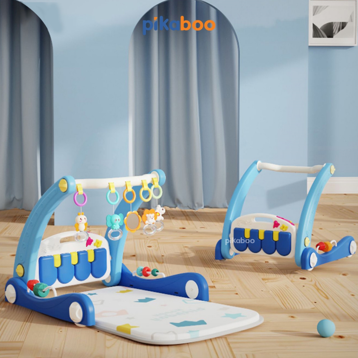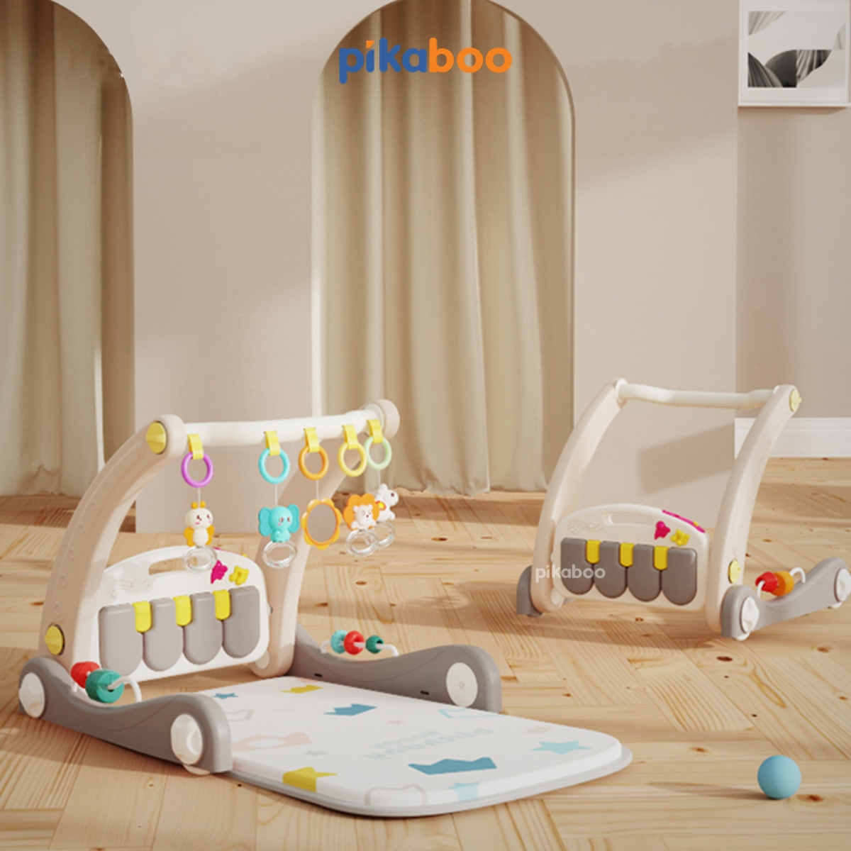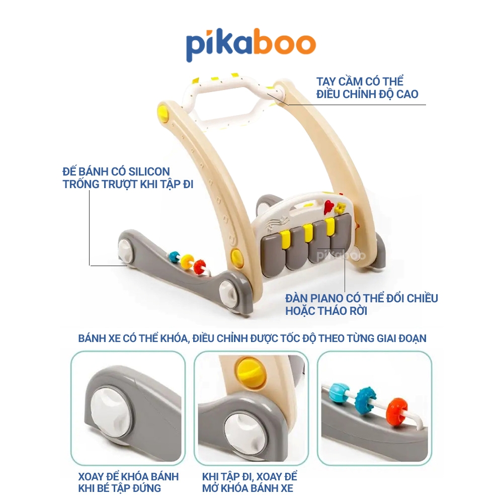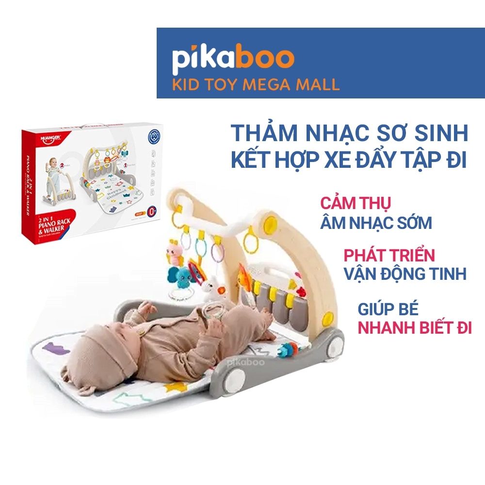 Đồ chơi 2in1 thảm nhạc piano kết hợp xe đẩy tập đi cho bé Pikaboo với nhiều chế độ nhạc kèm xúc xắc con vật ngộ nghĩnh. Chất liệu thảm dày dặn, hoạ tiết sắc nét. Khung thảm và xe tập đi chắc khoẻ, giúp con đứng vịn vững và nhanh biết đi từ những ngày đầu chập chững.