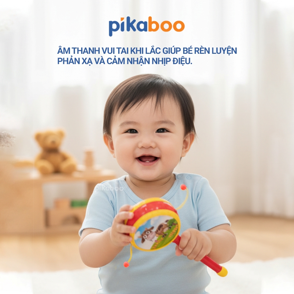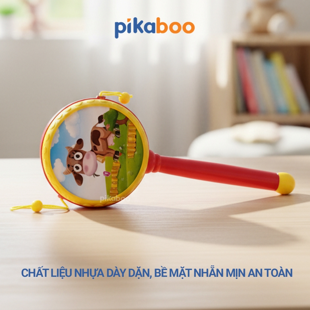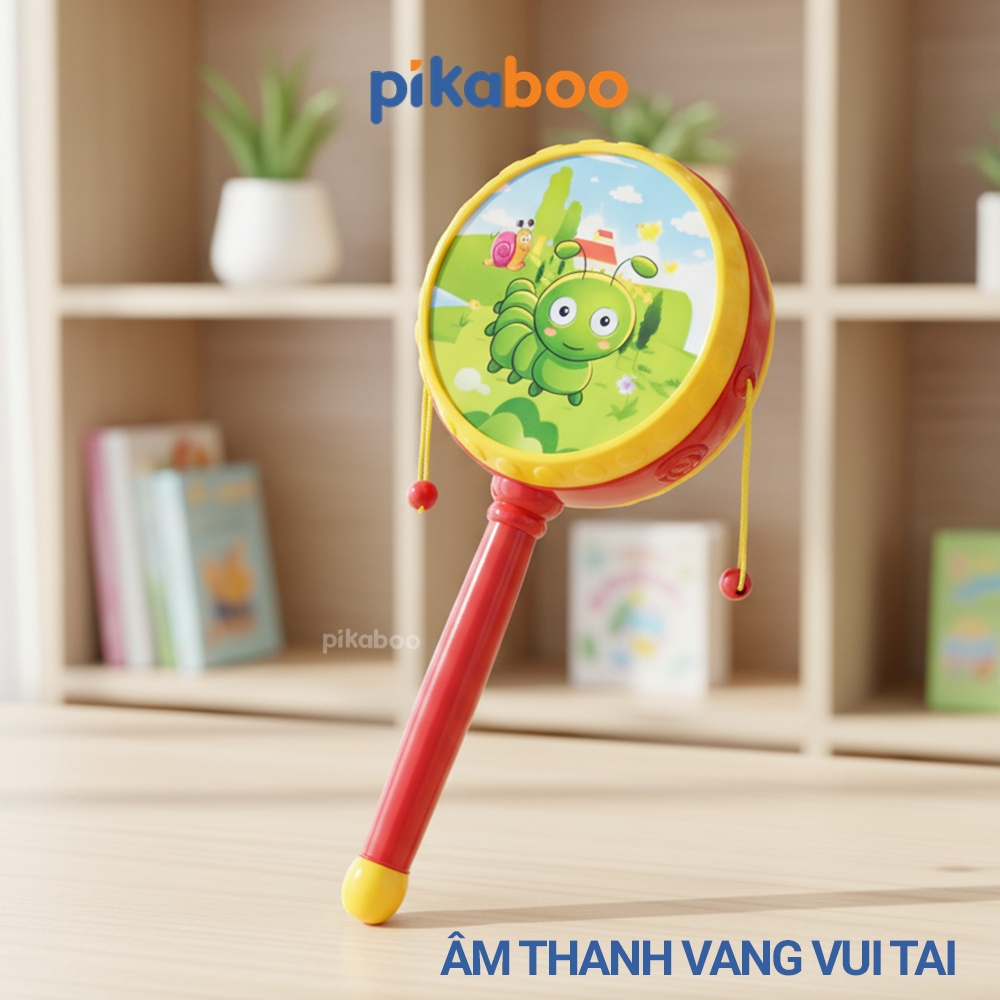Trống lắc là một món quà truyền thống để các bố mẹ sắm cho con vui chơi mỗi ngày, đặc biệt vào các dịp Tết đến Xuân về. Bộ sản phẩm trống lắc của Pikaboo có mặt trống in hình nhân vật siêu anh hùng, các con vật đáng yêu gắn liền với tuổi thơ của các con. Sản phẩm được thiết kế tay cầm nhỏ gọn, vừa vặn với tay bé. Khi lắc trống, âm thanh phát ra rất giòn giã, vui tai, kích thích phát triển thính giác, thị giác cho trẻ!