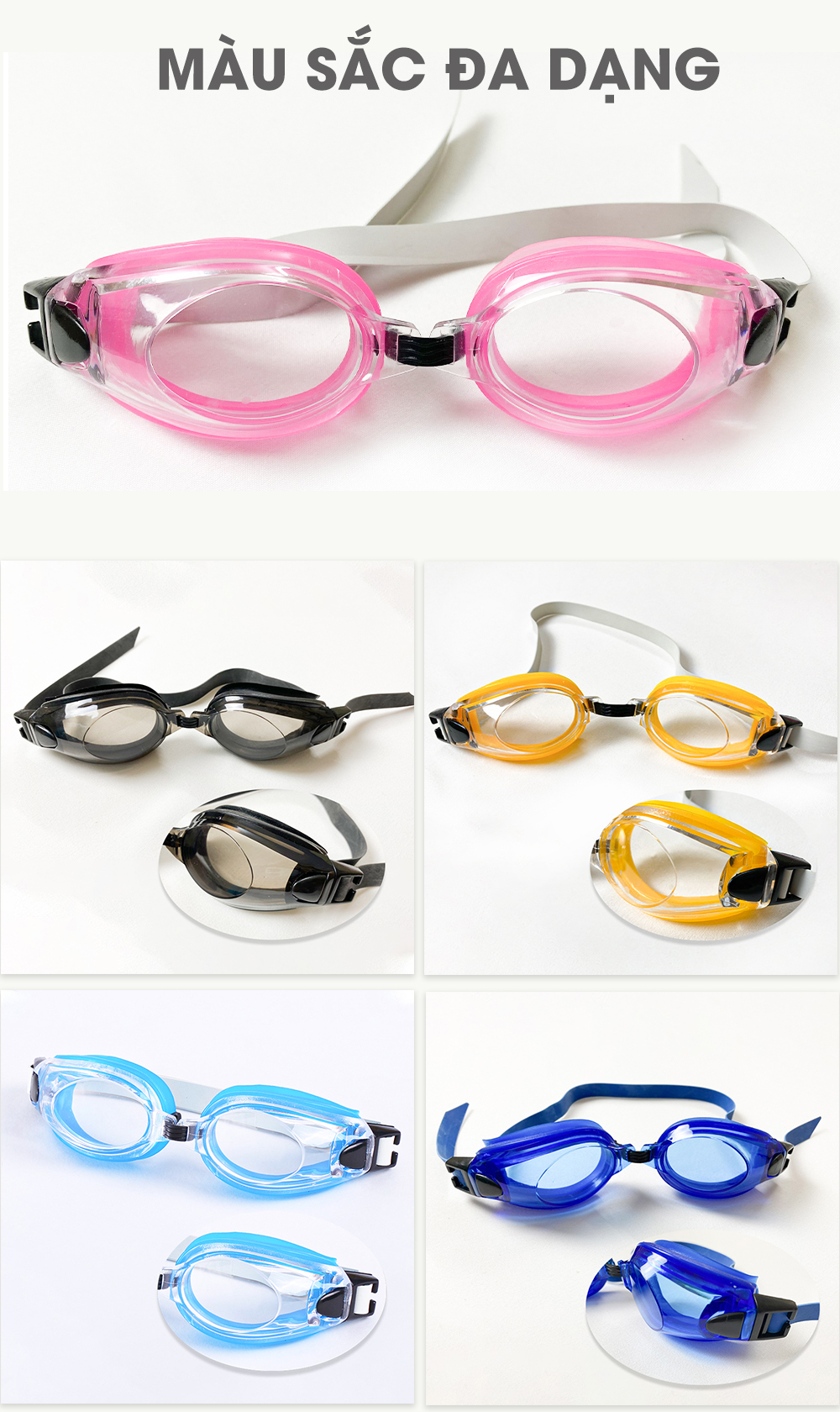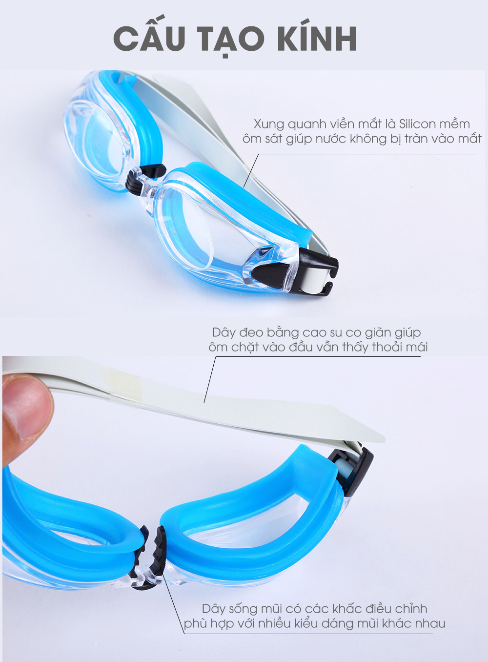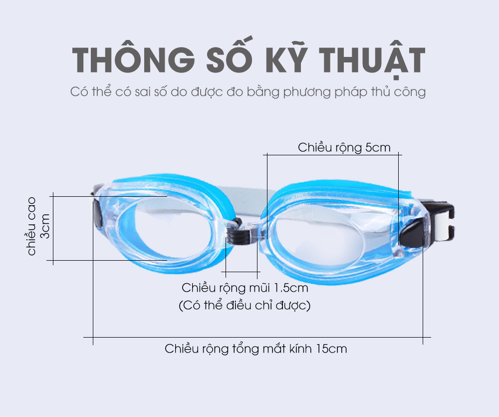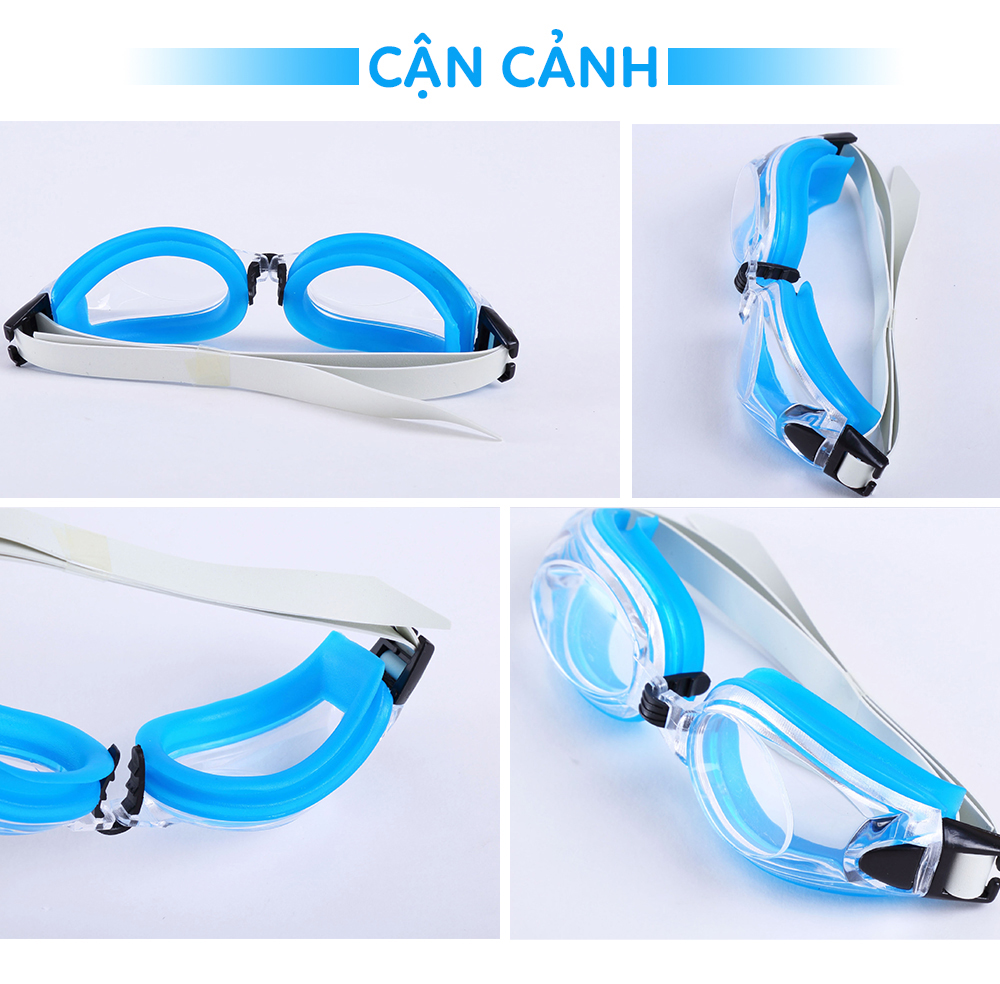 Kính bơi trẻ em được làm bằng chất liệu nhựa và silicone không gây kích ứng da, dây đeo chắc chắn